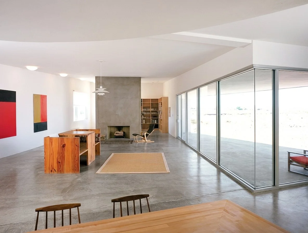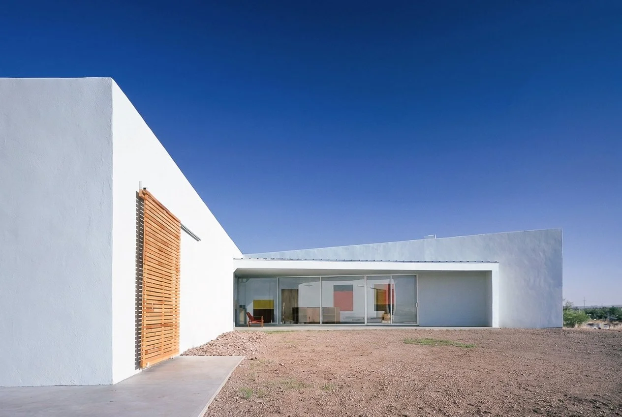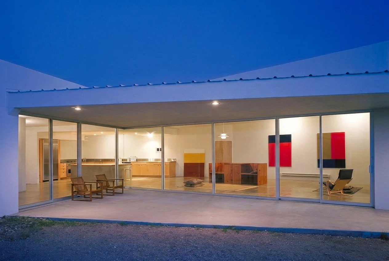 Built in the context of Donald Judd’s Marfa, this 2,600 square foot single-family house makes use of a traditional building material—adobe bricks—together with steel-spanning frames to create a contemporary courtyard residence. The design maximizes the spatial qualities of steel with flexible gallery and living areas, anchored by the kitchen, oriented north with a view through the “V” courtyard. In the more private areas, smaller window openings and diffused skylight and clerestory windows create intimate sleeping spaces.
